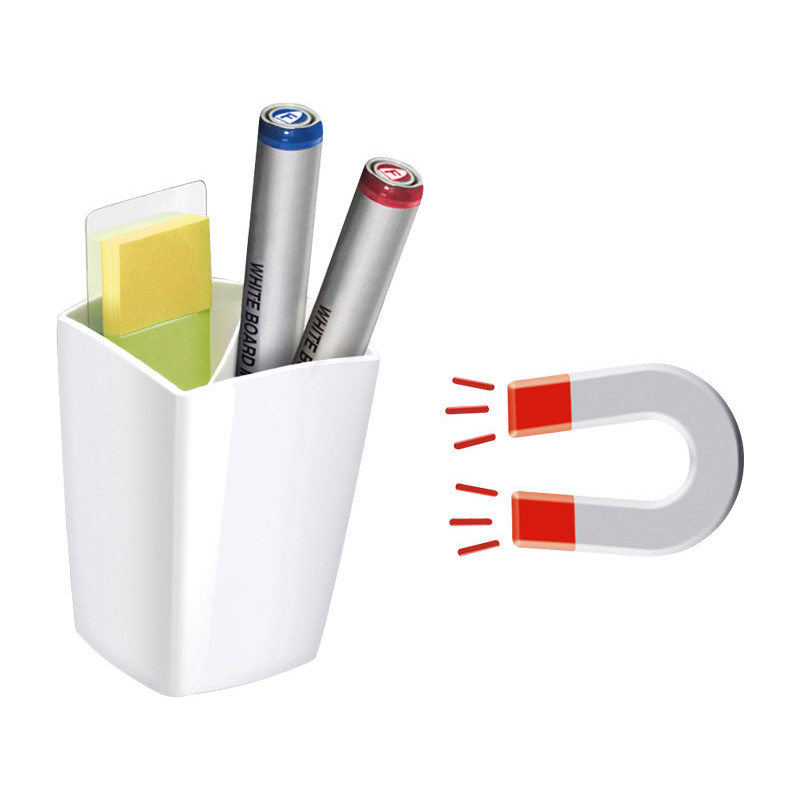 Cubilete magnético, con potente imán para su colocación sobre superficies de metal (pizarras blancas, armarios, etc). Moderno diseño con 2 compartimentos. Poliestireno de alto impacto. Dimensiones: 74x74x95mm.